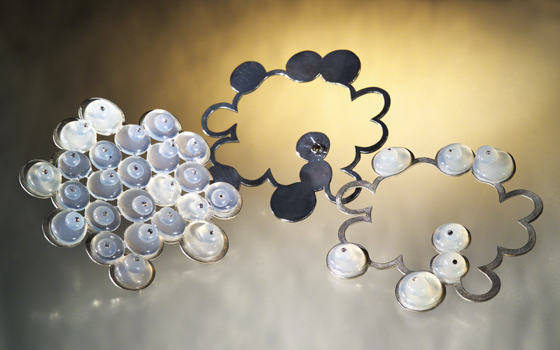 Broschen aus Silber, teils geschwärzt, Schmelzkleber, Diamant und Swarovskikristallen